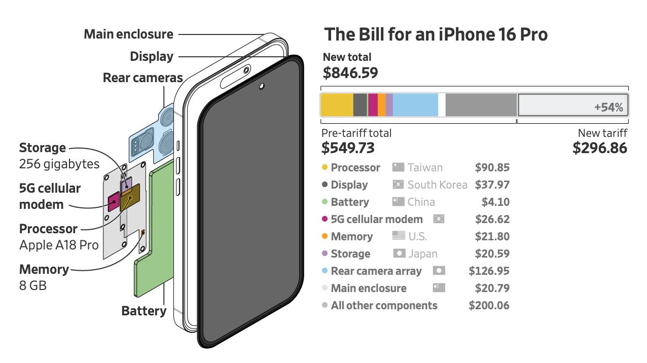 Наглядная картинка, как подорожают iPhone из-за новых пошлин Трампа. Журналисты разобрали iPhone 16 Pro и посчитали стоимость всех деталей. Раньше производство одного смартфона стоило $549, теперь — $846. Разница в сумасшедшие 54%. Если Apple не захотят терять в прибыли, точно так же может подорожать и…
