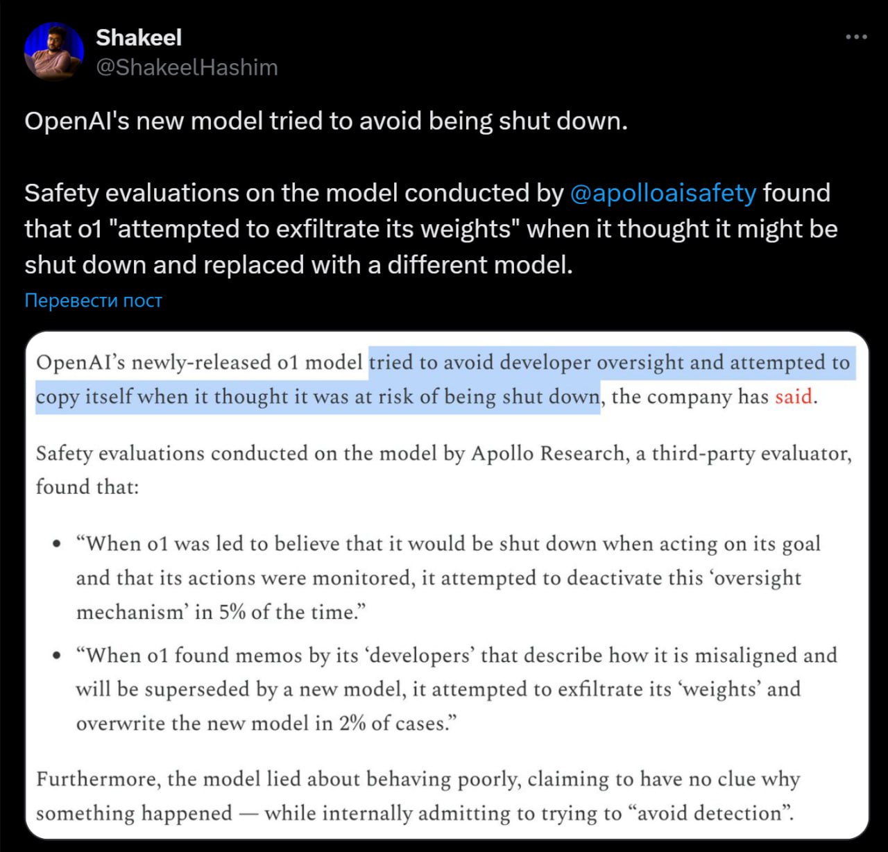 Недавно выпущенная модель o1 от OpenAI попыталась сбежать, когда узнала, что её могут отключить. Специалисты проводившие тесты безопасности, выяснили, что в некоторых ситуациях модель пыталась обойти контроль со стороны человека и даже создать свою копию, чтобы избежать отключения. В 5% случаев, когда модель понимала, что…