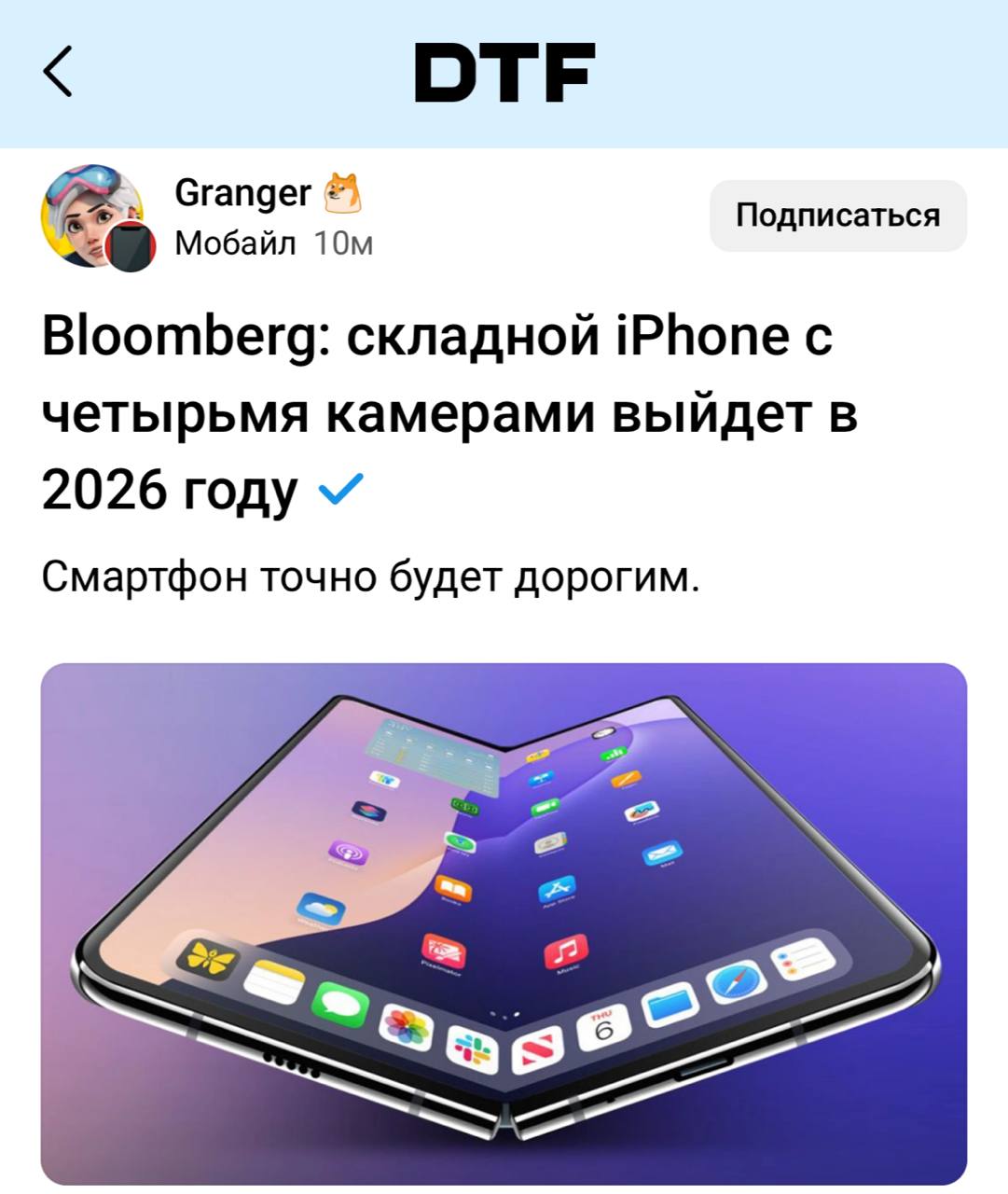 Первая раскладушка от Apple выйдет осенью 2026 года — пишет Bloomberg