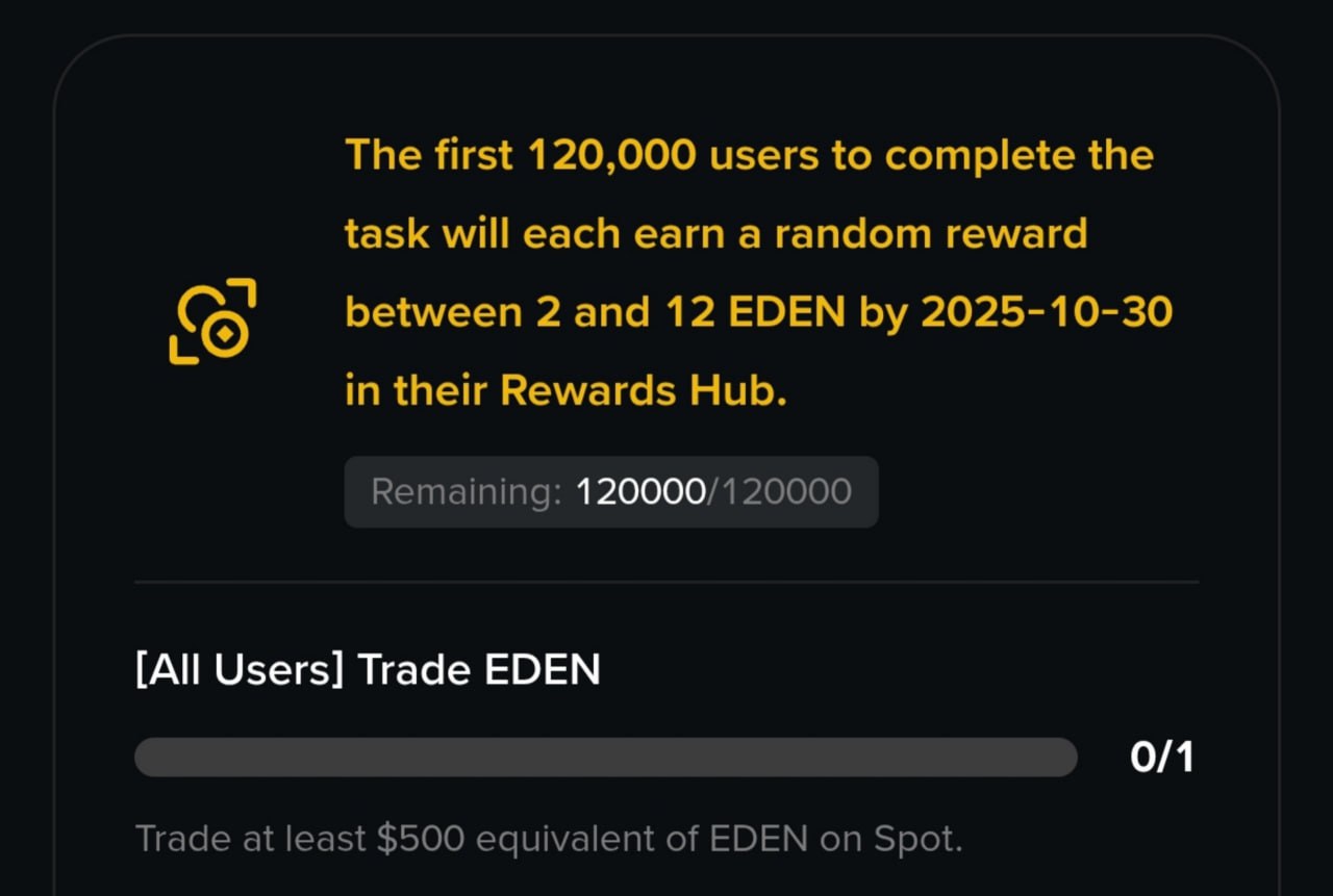 - Оборот на споте $500+ в паре EDEN/USDT (одной сделкой)