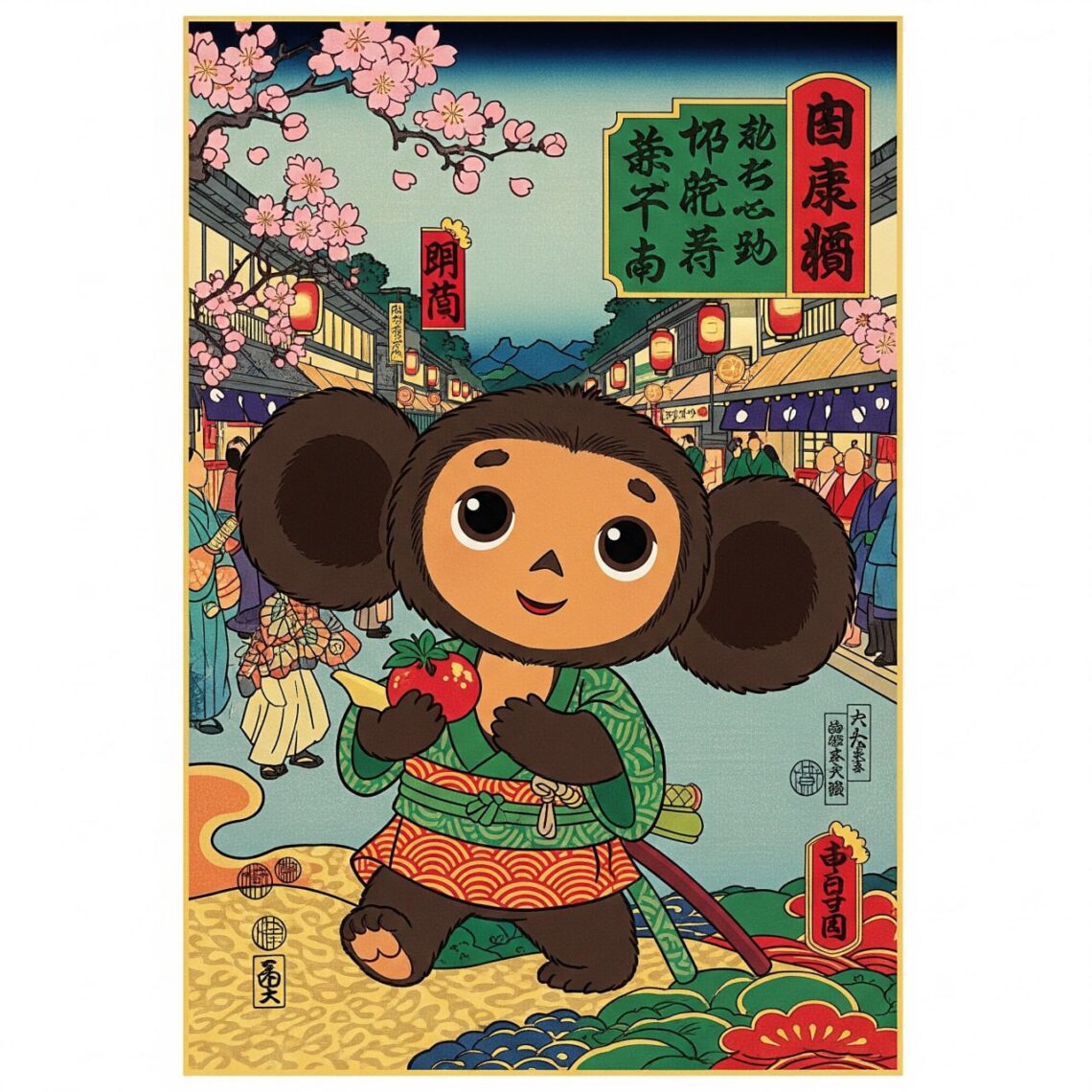Герои советских мультфильмов в японском стиле укие-э Чебурашка, Крокодил Гена и Волк…