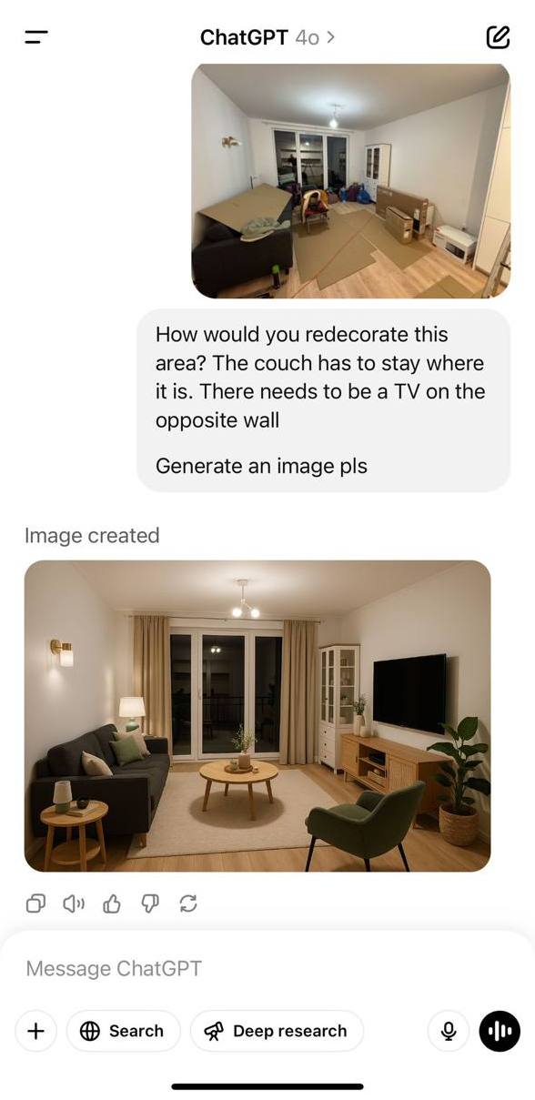 ChatGPT теперь расставляет мебель по фен-шую — кидайте фотку комнаты и просите навести уют.