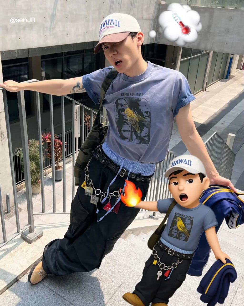 Вот моя фотография, а рядом со мной нужно сделать 3D мультяшного клона в том же стиле одежды (например, кепка, футболка с принтом, карго-штаны, цепочки на поясе). Мультяшная версия повторяет ту же позу и выражение лица, отличается увеличенной головой, яркими глазами и дружелюбной, позитивной мимикой. Стиль клона должен идеально совпадать с персонажами Apple Memoji. Цвета — яркие, освещение и фон — максимально близкие к реальному фото. Акцент на трендовом Z-поколении и визуальной гармонии между клоном и оригиналом. Картинка высокого качества, с мягкими тенями и чёткими деталями.