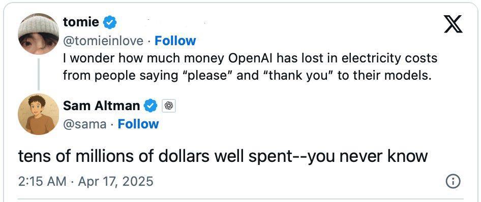 ChatGPT тратит под $100 млн на ваши «спасибо». Сэм Альтман признал: даже чтобы ответить на вежливость, нейронка проводит тонны вычислений — а это сервера, электричество, вода для охлаждения.