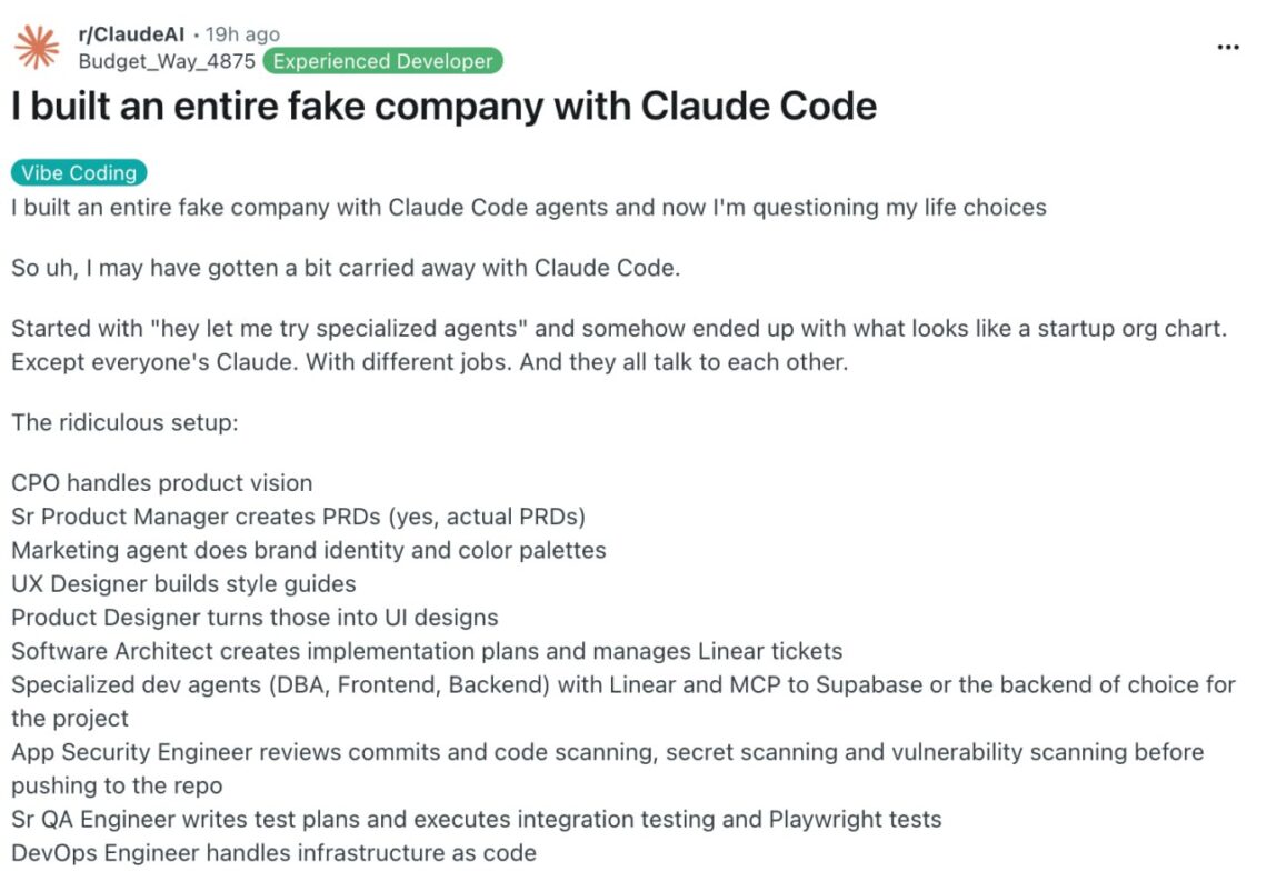 Реддитор построил фейковую компанию с помощью Claude Code: кроме него там работает 10 агентов — и они вполне успешно делают свой стартап.