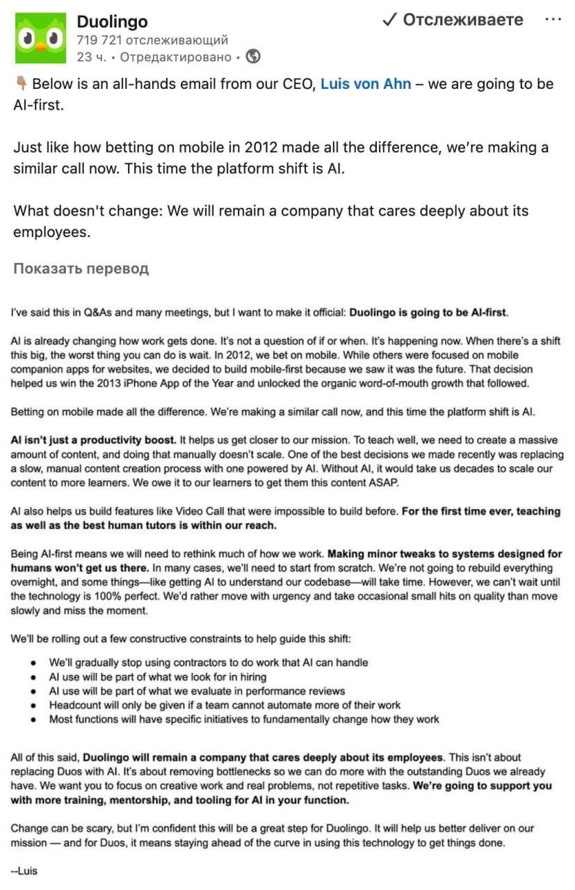 ИИ официально отбирает работу: Duolingo прекращают нанимать людей — большую часть задач компания с этого дня перекладывает на нейронки.