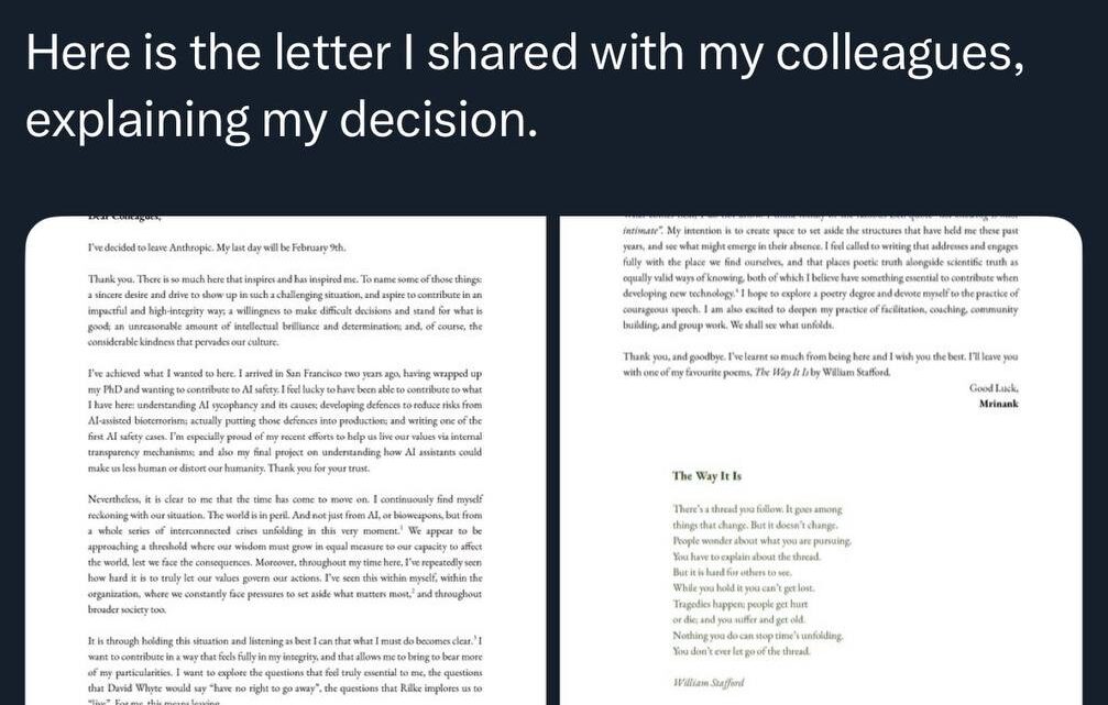 Глава отдела безопасности ИИ в Anthropic уволился с письмом о гибели мира и планах изучать поэзию.