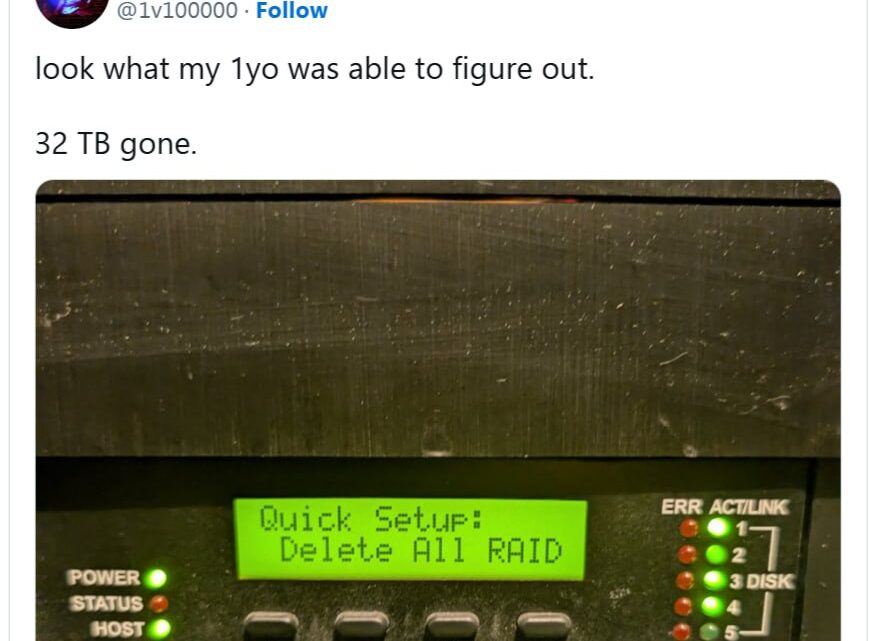 Годовалый ребёнок случайно почистил NAS-сервер — удалил 32 ТБ данных.
