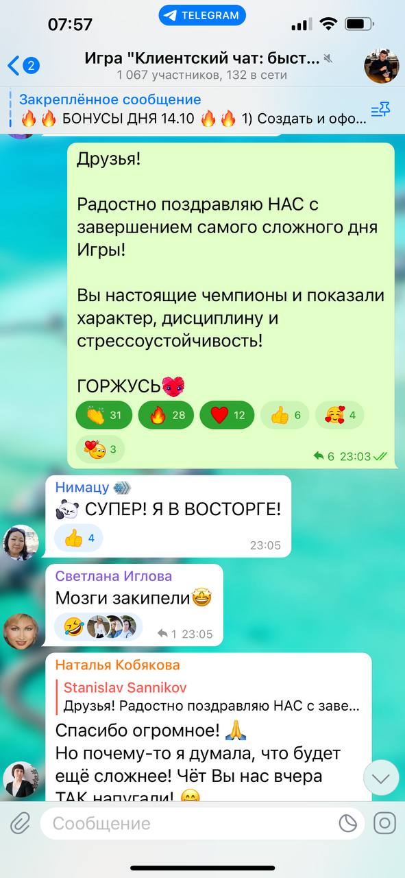 Это настоящие эмоции людей во второй день нашей Игры по Клиентским чатам. У нас уже продажи продукции через КЧ участников суммарно на сотни тысяч рублей за несколько дней. Но главное — даже не это. Главное то, что навыки и опыт останутся у участников Игры навсегда. А значит, Игра будет годами приносить прибыль и давать свои результаты. Вот почему инвестиции в обучение — самые лучшие. Следующие Игры будут запускаться в этом чате, подпишитесь сейчас чтобы не пропустить: