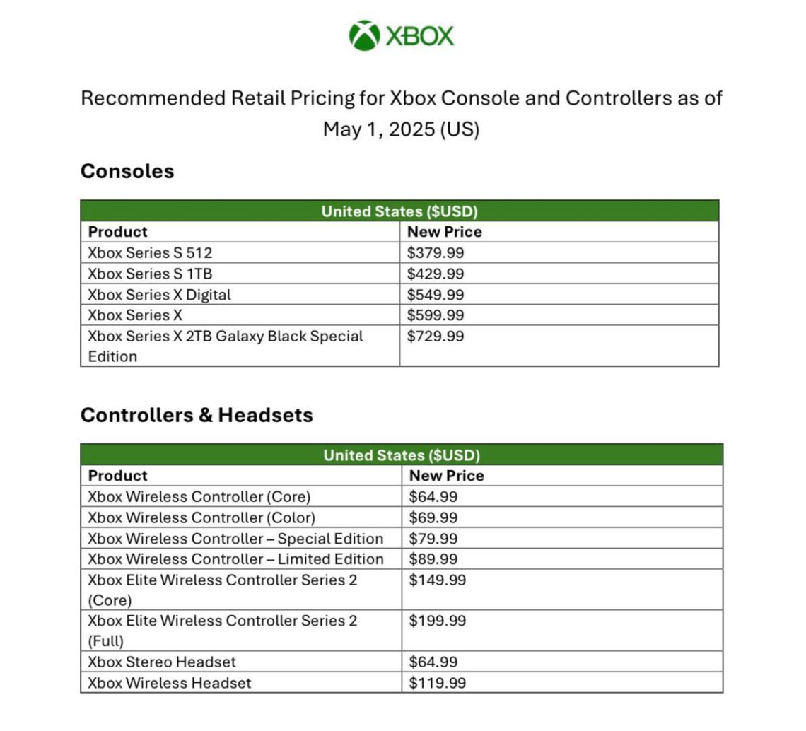 Цены вырастут на всю игровую продукцию Microsoft, включая консоли. Теперь Xbox Series X будет продаваться за $600 (было $500), а бюджетный Series S — за $380 (было $300).