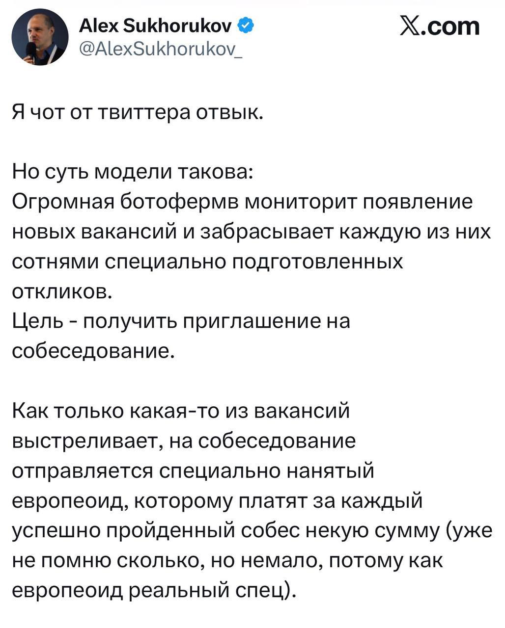 Кодеры из Поднебесной запускают ботов, которые находят вакансии и спамят сотнями идеальных резюме. Собеседование проходит сеньор-европеец, который получает комиссию за оффер. Работу берут джуны/мидлы-китайцы.