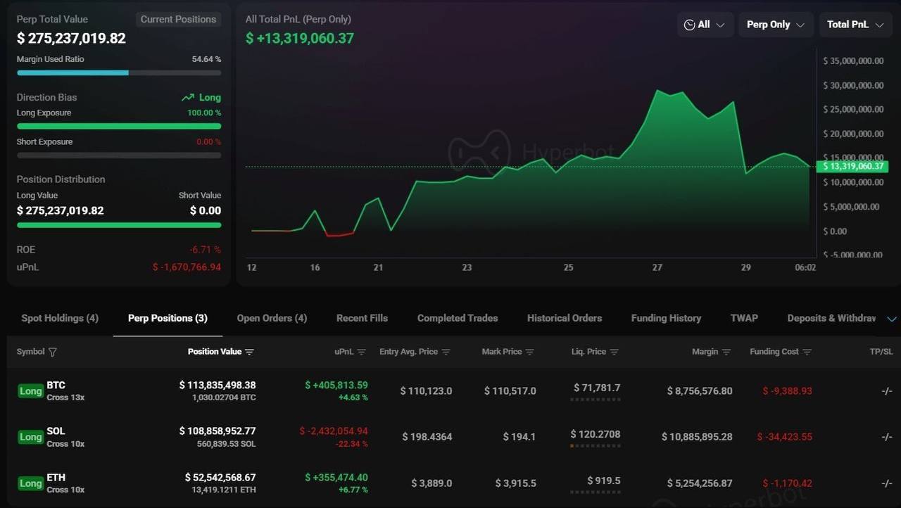 Биткоин все же вернулся на $111k, несмотря на «успешные» переговоры Трампа и Си, которые, как предполагалось, могли вызвать некоторую волатильность на рынках. Еще один трейдер на Hyperliquid, известный своим феноменальным 100-процентным винрейтом, решил сделать ставку на рост, открыв лонги по ETH, BTC и SOL на внушительные $275 млн. Это решение, вероятно, основано на анализе текущих рыночных тенденций и ожидании дальнейшего восходящего движения. Пора возвращаться к росту.