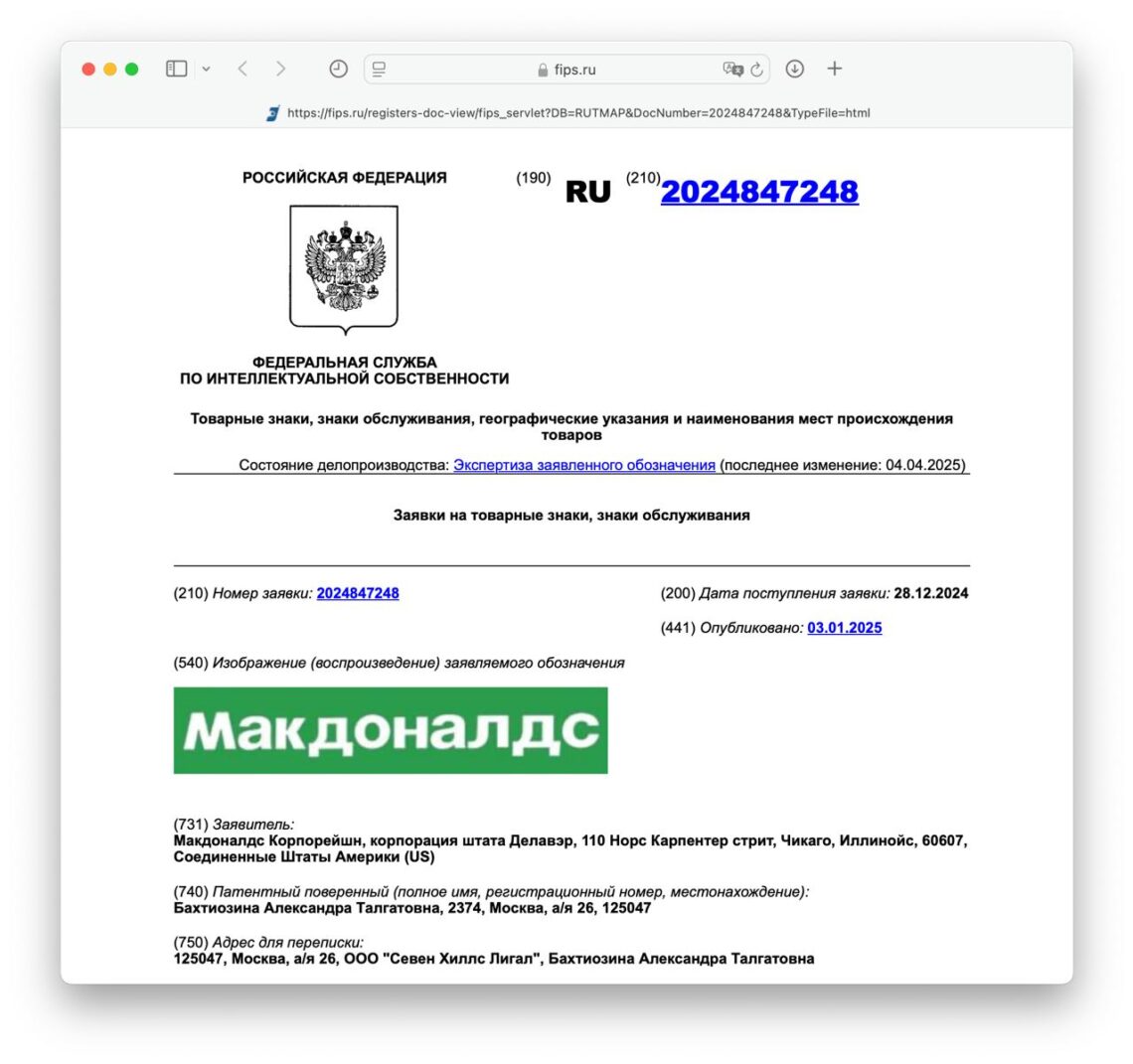 Заявитель — реальный владелец McDonald’s. Компания подала заявку еще в декабре 2024-го, а в апреле ведомство решило ее рассмотреть. Результата пока нет.
