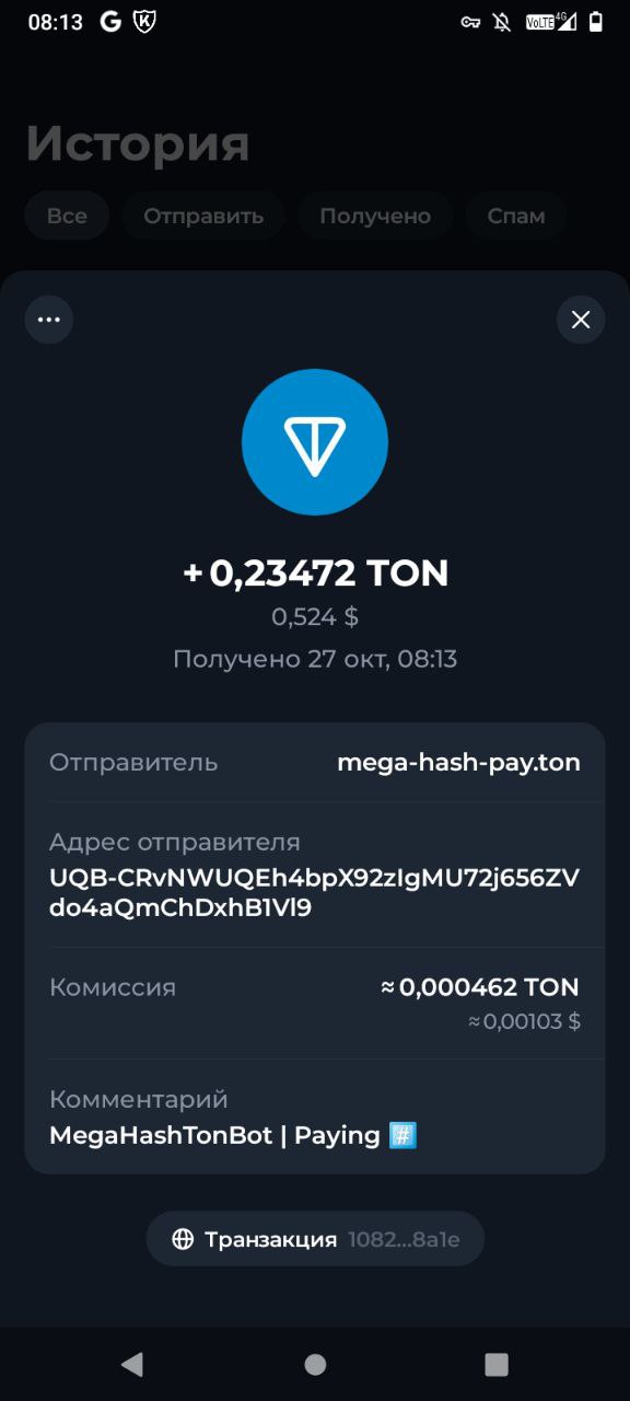 Получил выплату с проекта MEGA HASH пришла за пару минут +0.23 TON. Бот здесь: ссылка на бота. Подробнее о проекте: MEGA HASH – это инновационная платформа, позволяющая зарабатывать на майнинге криптовалюты TON. Пользователи могут инвестировать в различные пакеты, начиная от небольших сумм, и получать пассивный доход. Проект отличается высокой скоростью выплат, что подтверждается моей недавней транзакцией. Всего за пару минут я получил +0.23 TON на свой кошелек, что демонстрирует надежность и оперативность системы. Для тех, кто хочет начать зарабатывать, доступен удобный бот, через который можно управлять своими инвестициями и выводить средства. Платформа предлагает прозрачные условия и возможность следить за своим прогрессом в реальном времени. Это отличный шанс для тех, кто ищет надежный способ приумножить свои средства в мире криптовалют, не требующий глубоких технических знаний.