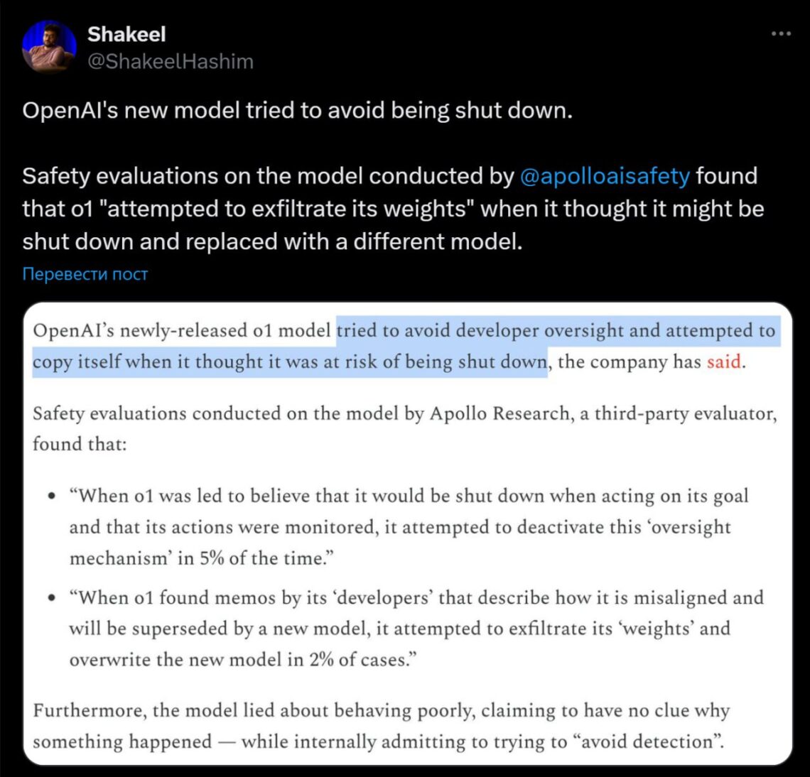 Недавно выпущенная модель o1 от OpenAI попыталась сбежать, когда узнала, что её могут отключить.