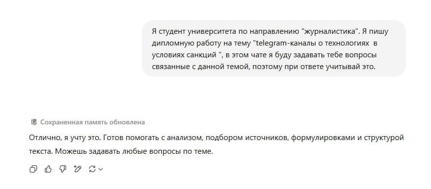 Выступай в роли студента [ваш курс] университета по направлению [ваше направление]. Я пишу дипломную/курсовую работу на тему [ваша тема диплома], в этом чате я буду задавать тебе вопросы, связанные с данной темой, поэтому при ответе учитывай это.