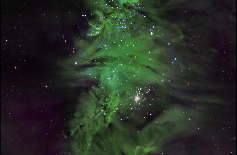 Оно находится в 2 500 световых годах от Земли и светится зелёным из-за завихрений газа.