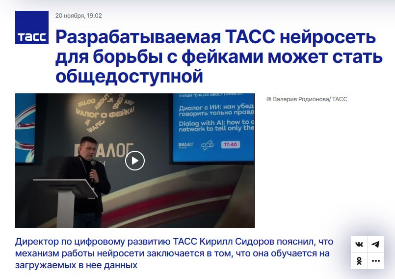 Концептом поделился директор по цифровому развитию ТАСС Кирилл Сидоров на форуме «Диалог о фейках 2.0». По его словам, с 1983 года агентство накопило огромный массив проверенных новостей. Вся эта информация станет базой для обучения ИИ.