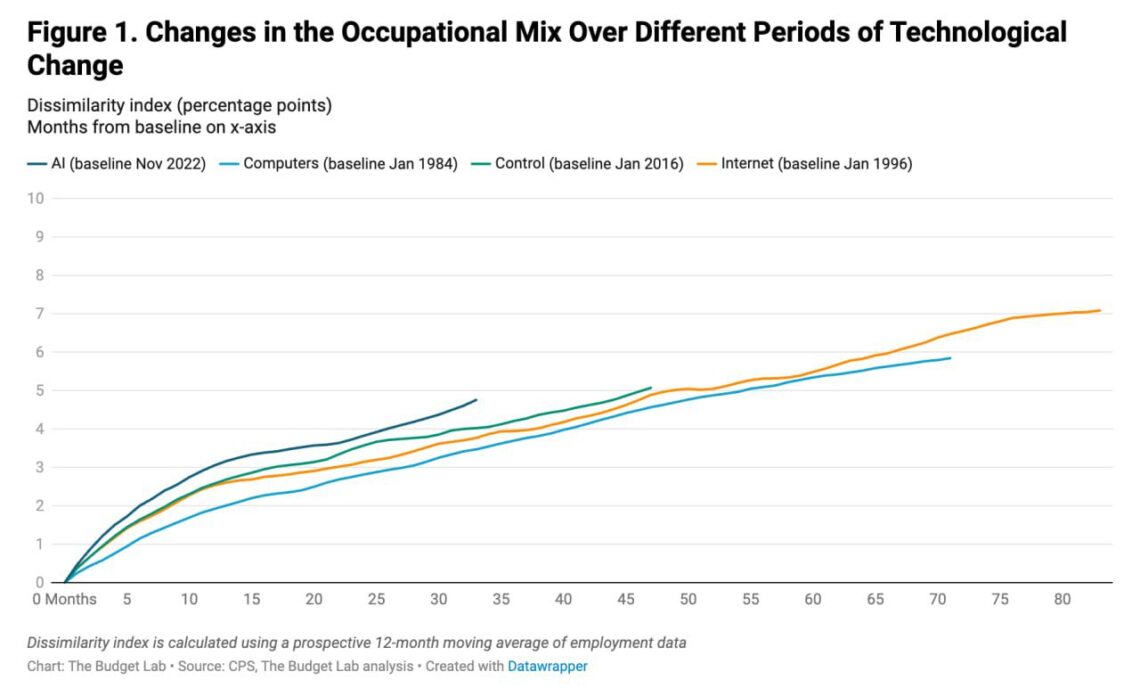 Ещё интереснее: изменения в структуре рынка труда сравнили с эпохой внедрения компьютеров (1996–2002) — тогда сдвиги были в пределах 7%. То есть ИИ меняет рынок труда всего лишь на 1/7 от того, как это сделали ПК и интернет.