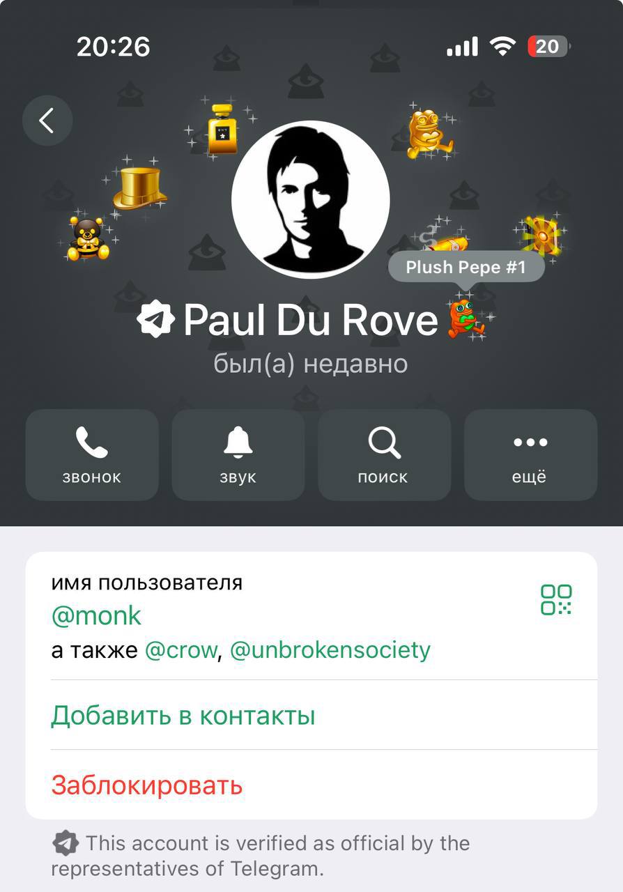 Также в описании профиля Дурова появилась подпись, что он официально подтверждён командой Telegram. Раньше такую отметку получали только каналы.