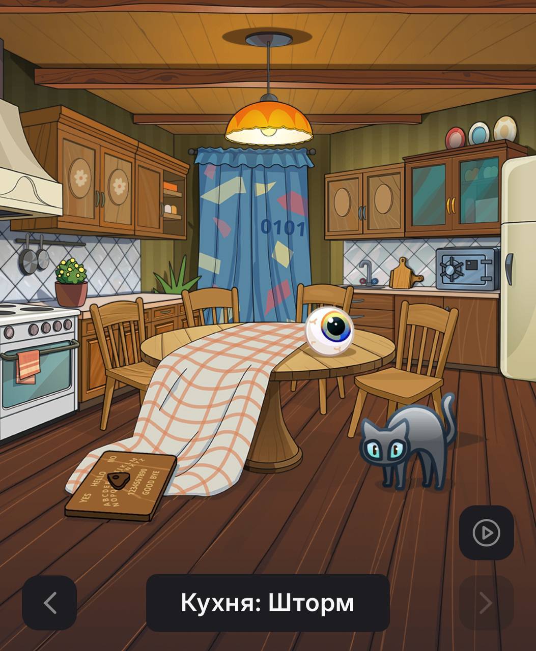• Внутри бота нас ждет интерактивная комната. Необходимо внимательно осмотреться и нажимать на различные предметы. После взаимодействия с определенными предметами, на шторах появится заветный код. Это требует некоторой наблюдательности и, возможно, терпения, чтобы найти правильную последовательность действий.