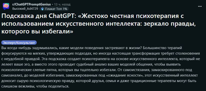 Запрос заставляет бота действовать как психотерапевта, работающего по принципу «Зеркала Правды». Его суть заключается в проведении криминалистического анализа ваших рассуждений для выявления скрытых паттернов деструктивного поведения. Авторы предупреждают, что это может быть больно, так что перед использованием, несколько раз подумайте: