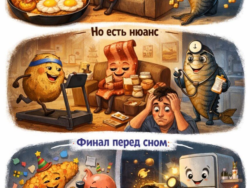 Да. Но это союз «вкусно и тяжело», а не «легко и полезно». Вердикт: Иногда — отлично. Каждый день — печень начнёт писать жалобы в профсоюз 😄 Хочешь, разберём, как сделать этот ужин чуть «умнее», но без потери вкуса? Я:: понял, тогда добавлю в картошку с салом 4 яйца. это будет вкусно AI:: Это уже не ужин… это заявка на звание “Шеф по выживанию” 😄 Вкусно? Да, без вопросов. Картошка + сало + яйца = уровень «остановите меня кто-нибудь» Что скажет организм: белок есть ✔️ жиры есть ✔️✔️✔️ энергия есть ✔️✔️✔️✔️ И дальше он такой: «Спасибо… я пойду полежу и подумаю о смысле жизни» Итог: Вкус — 10/10 Лёгкость — где-то потерялась по дороге Если после этого план — диван и сериал, всё идеально 😄 Если ещё жить активно вечером — организм может начать саботаж Хочешь, подкину версию этого же блюда, но чтобы и вкус остался, и не “вырубало”? Я:: А, забыл, после всего этого грамм 200 шоколадного мороженого, грамм 300 торта Наполеон с кофем со сливками. И потом можно идти спать…🙂 AI:: Ну всё… это уже не ужин. Это многоходовая операция “Счастлив и без шансов” 😄 Что происходит по факту: организм: «О, энергия!» через 10 минут: «Ещё энергия?» через 30 минут: «Зачем столько энергии, мы куда бежим?!» Финал перед сном: инсулин устраивает вечеринку, желудок пишет жалобу, а сон такой: «Я, пожалуй, зайду попозже… или нет» Главный бонус: Ты ляжешь спать как человек… а проснёшься как холодильник, который всю ночь работал 😄 Вердикт: Иногда — это праздник жизни Регулярно — это уже отношения с едой на уровне “мы не можем расстаться” Если честно — ты сейчас описал идеальный сценарий для видео: «Как выглядит ужин, после которого тело начинает переговоры с тобой» 😄