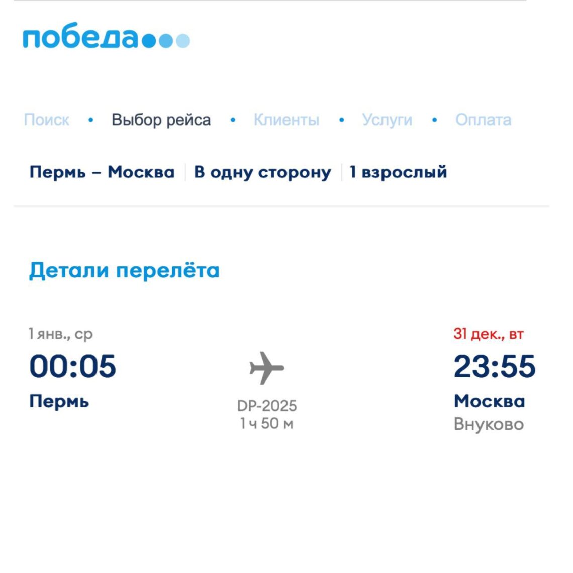 Рейс Пермь → Москва вылетает 01 января 2025 года, а прилетает 31 декабря 2024. Стоимость билета в прошлое — всего 3399₽.
