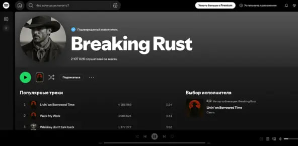 Breaking Rust начал размещать музыку на Spotify в 2025 году — с галочкой верификации. На 11 ноября у него более 2 млн слушателей в месяц. Песню Walk My Walk на площадке прослушали 3 млн раз, Livin’ on Borrowed Time — более 4 млн раз, Whiskey Don’t Talk Back — 1 млн раз.