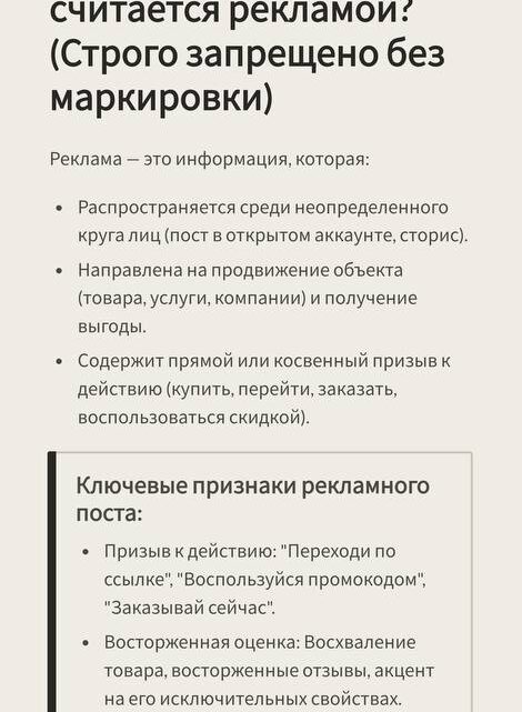 Хотя тема запрета рекламы в социальных сетях вызывала много обсуждений, для блогеров и креаторов в запрещенной сети практически ничего не поменялось. Там по-прежнему можно и нужно создавать контент, избегая прямых призывов к покупке.