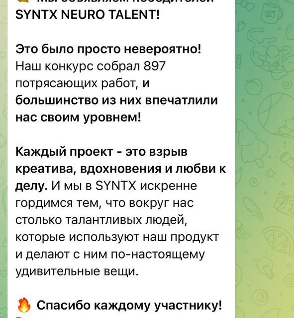Конкурс Syntx известен своей жесткой конкуренцией и высокими требованиями к оригинальности. Занять место в ТОП-10 среди почти тысячи участников — это показатель профессионализма высочайшего уровня. Мы гордимся тем, что наша методика обучения позволяет участникам быстро адаптироваться и превосходить ожидания.