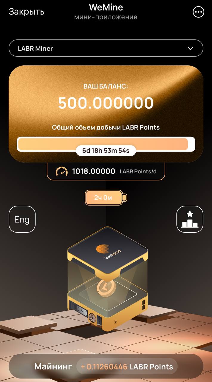 Особо стоит отметить, что участие в майнинге с LABR майнером доступно абсолютно без вложений. WeMine предоставляет возможность начать добычу криптовалюты, не требуя от вас первоначальных инвестиций. Это делает платформу доступной для широкого круга пользователей, включая новичков в мире криптовалют, которые хотят попробовать себя в майнинге без финансового риска. Ваша активность и время – вот ваши главные активы.