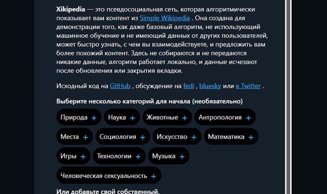 Xikipedia это псевдосоцсеть, которая подстраивается под предпочтения юзера и выдаёт ему вики-статьи, которые 100% увлекут его. Сперва вы выбираете любимые темы, а затем алгоритм выдаёт только самую интересную инфу.