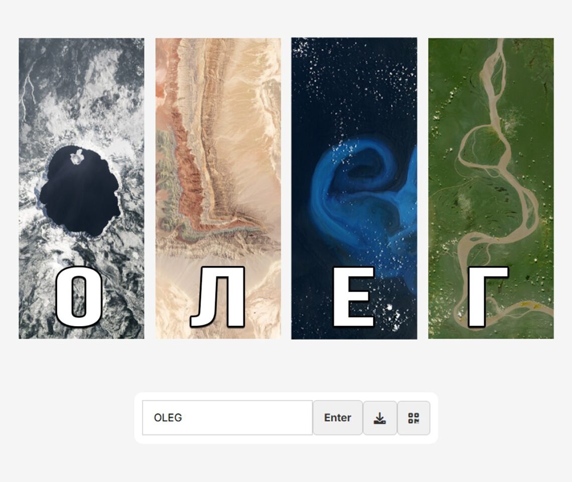 Вводишь слово на латинице — и нейросеть находит спутниковые снимки, где рельеф, облака и реки складываются в нужные буквы. Всё это — реальные кадры с орбиты.