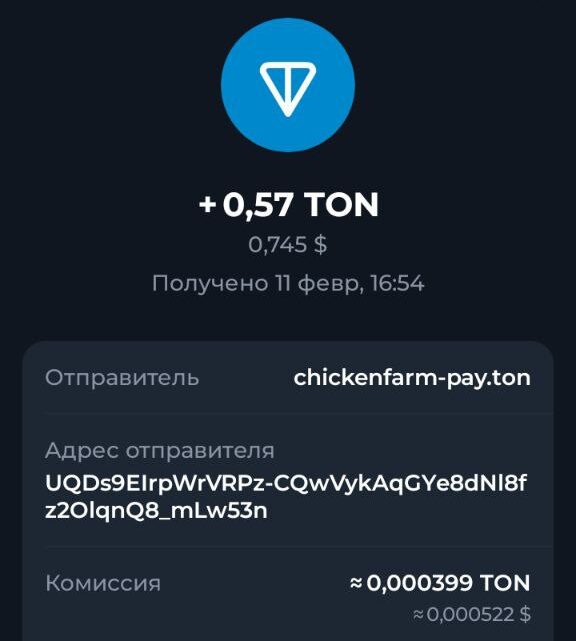 🚀 Вывел немного с проекта Chicken Farms +0.57 TON 👉 Бот здесь: 📝 Подробнее о проекте: